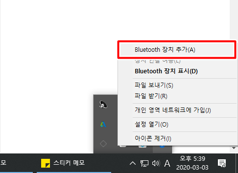 블루투스 동글을 꽂고 이렇게 우측하단에 보이는 ^ 아이콘을 눌러보면 위사진처럼 컴퓨터에 실행중인 프로그램 아이콘들이 나오게 될겁니다. 위에 빨간색 박스로 표시돼있는 블루투스 아이콘을 클릭해주세요.