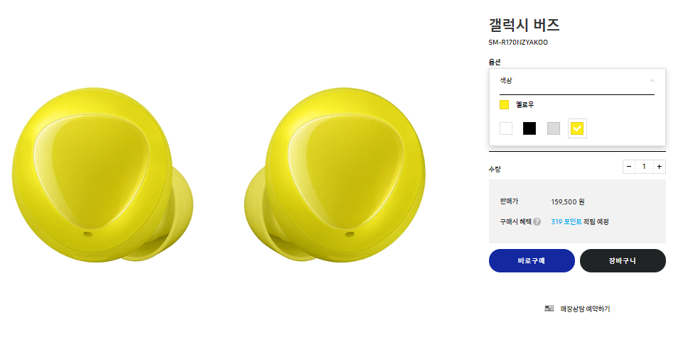 갤럭시 버즈는 화이트, 블랙, 실버, 옐로우 4개의 색상으로 구성되어있으며 정식 판매가는 159500입니다.