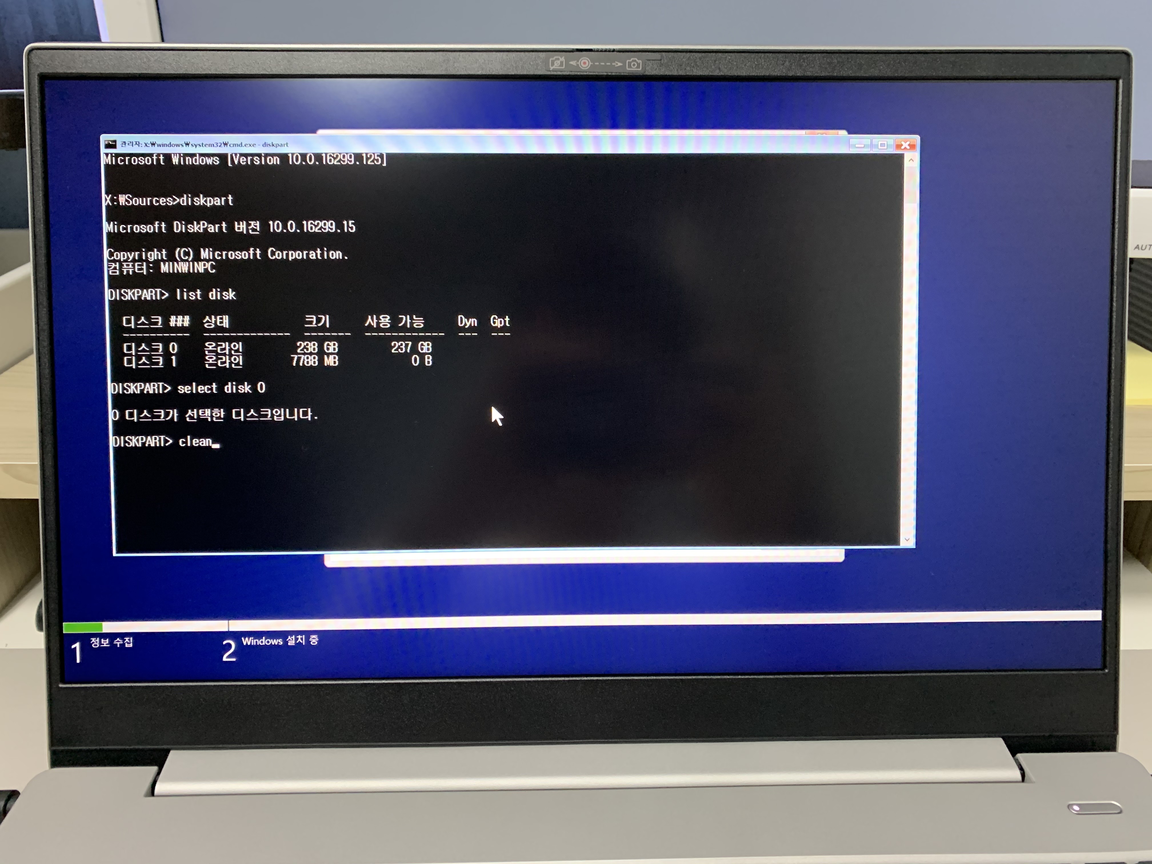 그러면 이제 선택한디스크가 몇번 디스크인지 나오게 됩니다. 그 다음으로는 clean을 입력해서 디스크를 정리해줍니다.