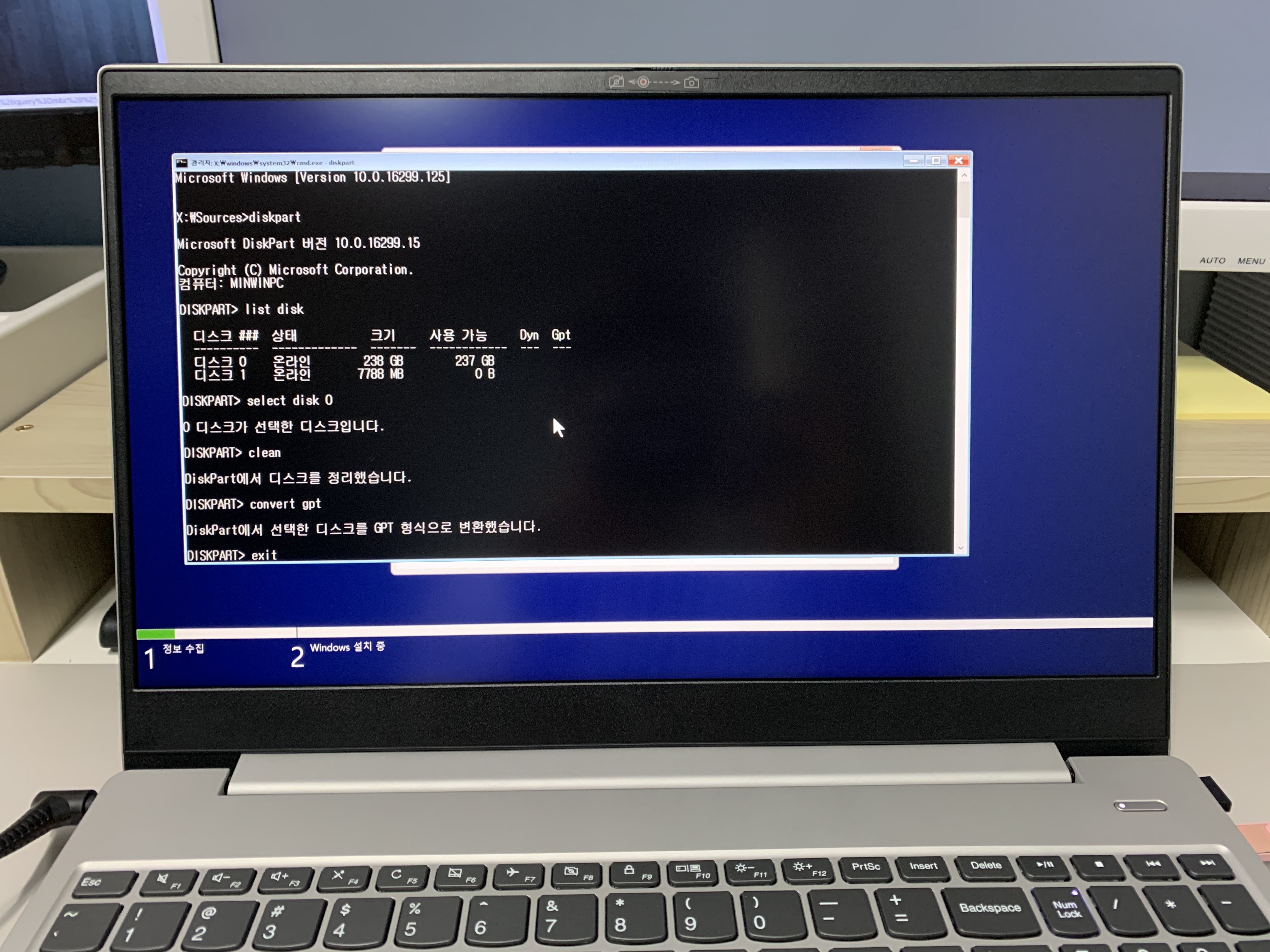 그다음으로 Diskpart 에서 선택한 디스크를 GPT 형식으로 변환했다는 문구가 나오게되면 exit를 눌러서 나가면되는데 그냥 닫기버튼을 눌러도 무방할 듯 합니다.