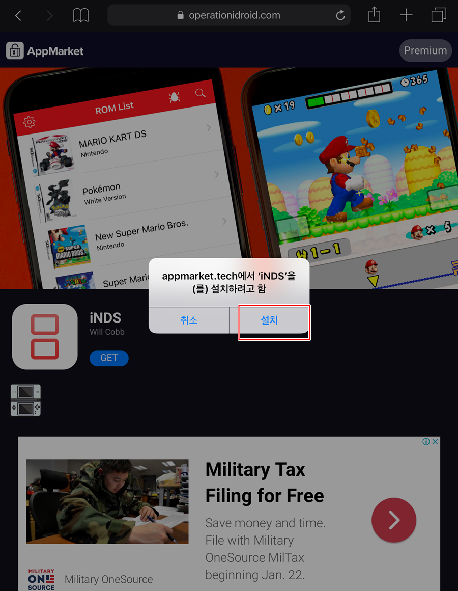 Appmarket.tech 에서 iNDS를 설치한다는 화면이 나올겁니다. 설치를 누르면 자동으로 i NDS 어플이 다운로드 될겁니다.