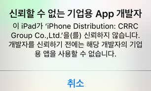 이런식으로 신뢰할 수 없는 기업용 App 개발자라는 화면이 나올겁니다. 이럴때는 설정으로 이동해주세요.