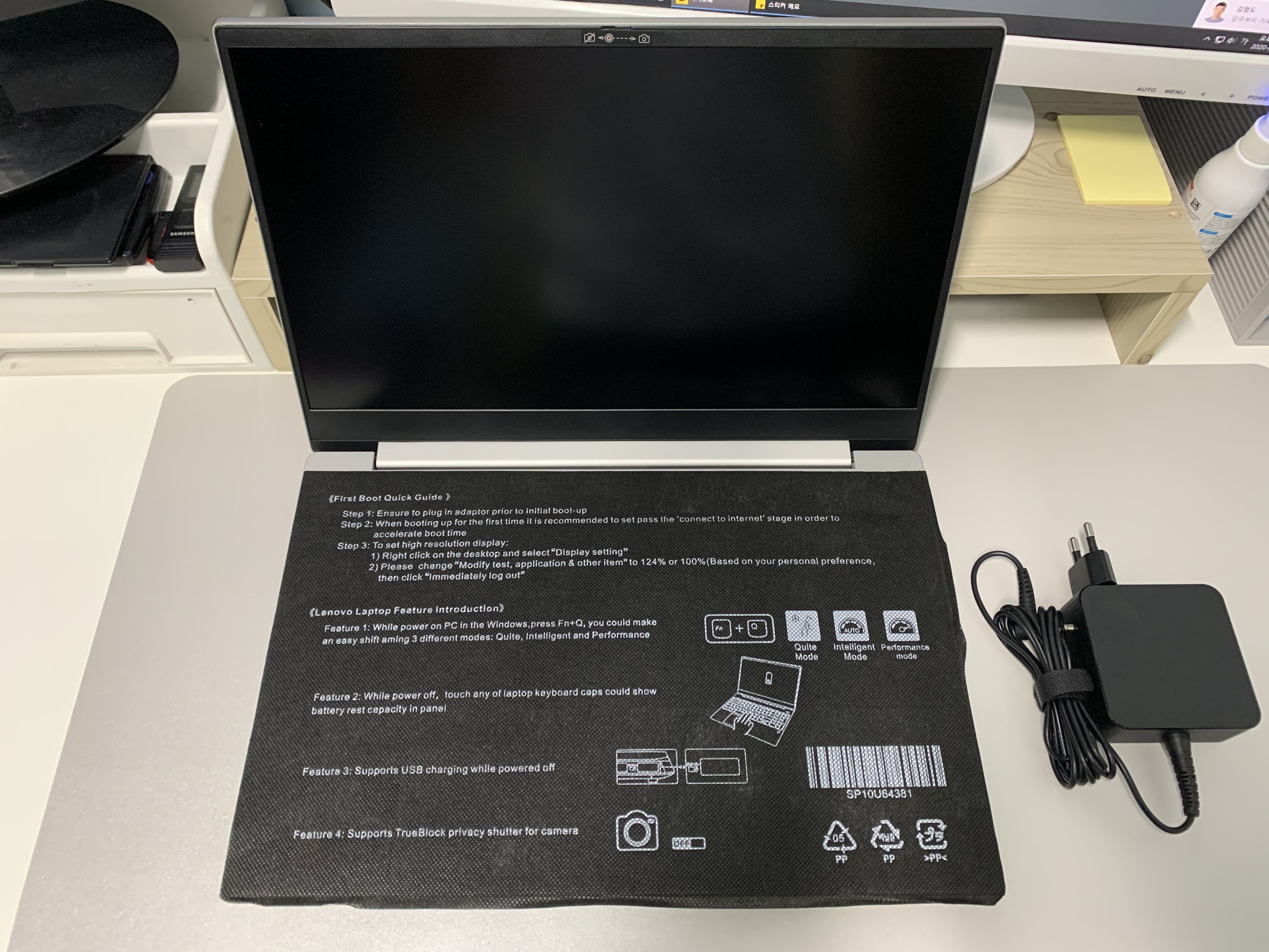 노트북을 열었을때는 이렇게 사용설명서가 적혀있는 커버가 있습니다. 새 노트북임을 알려주는 느낌이네요 ㅎ