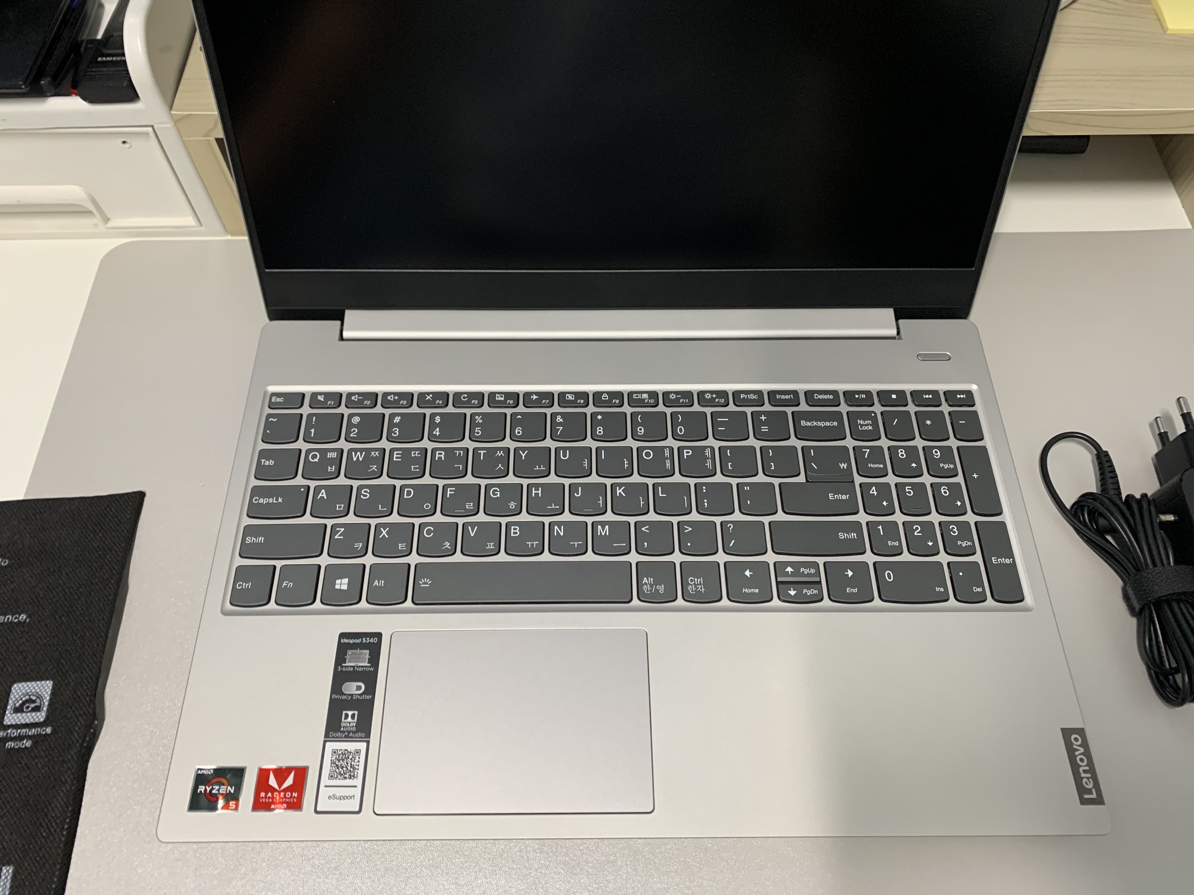 왼쪽하단에 보면 이렇게 스티커가 여러개 붙혀져있는데 라이젠이랑 s340 기능에 대해서 써놓은 스티커입니다. 생각보다 눈에 많이 띄어서 떼버리는거도 좋은방법일듯 합니다...