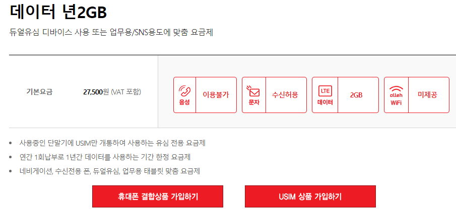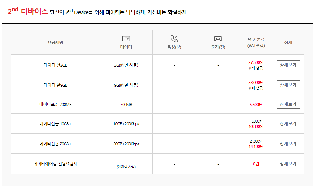 2nd디바이스 요금제의 맨위에있는 데이터 년 2GB요금제를 한번 살펴보았습니다. 이 요금제는 연간 1회만 납부해서 수신용 핸드폰으로 사용을 하는 요금제 인듯합니다.