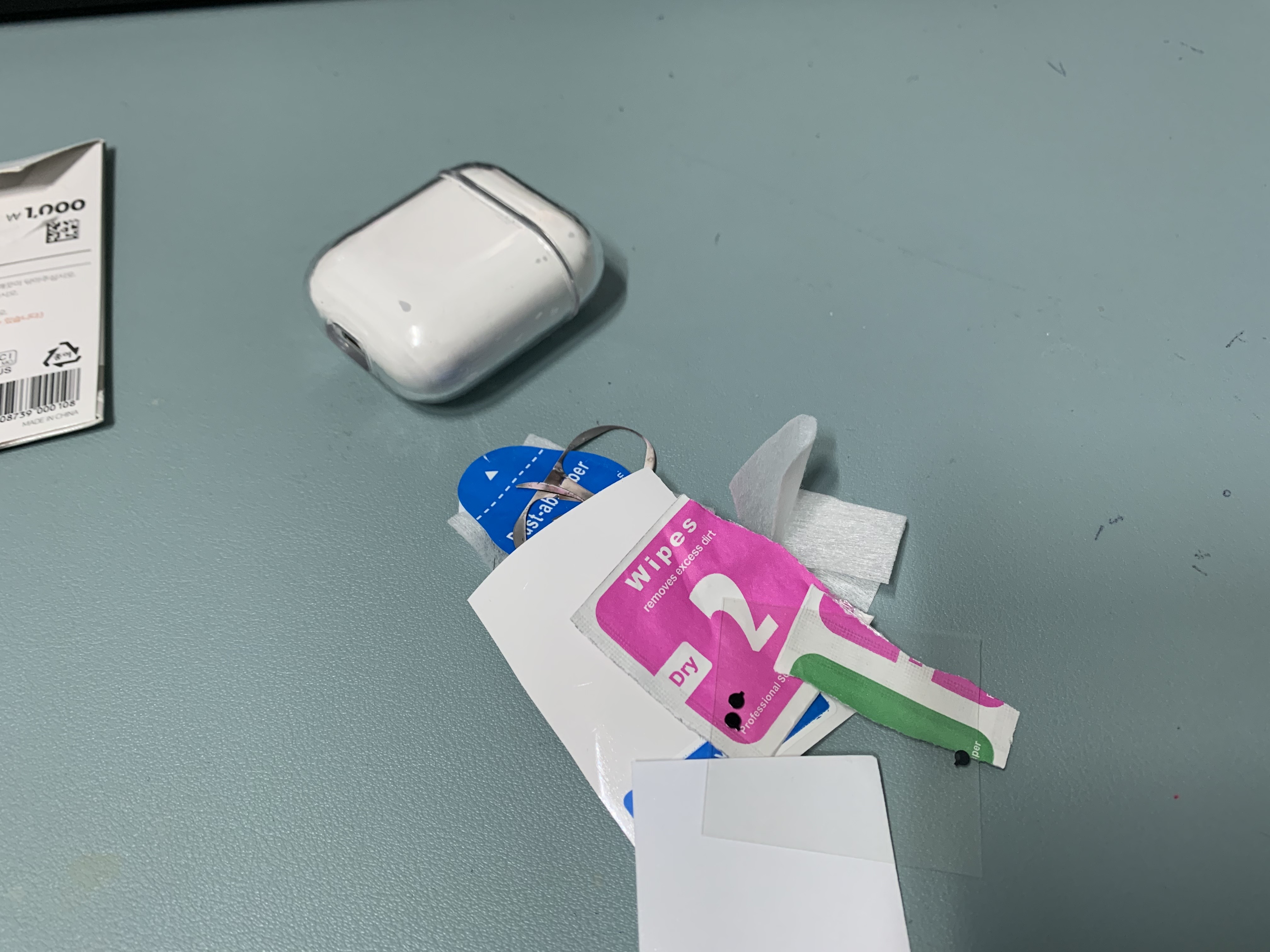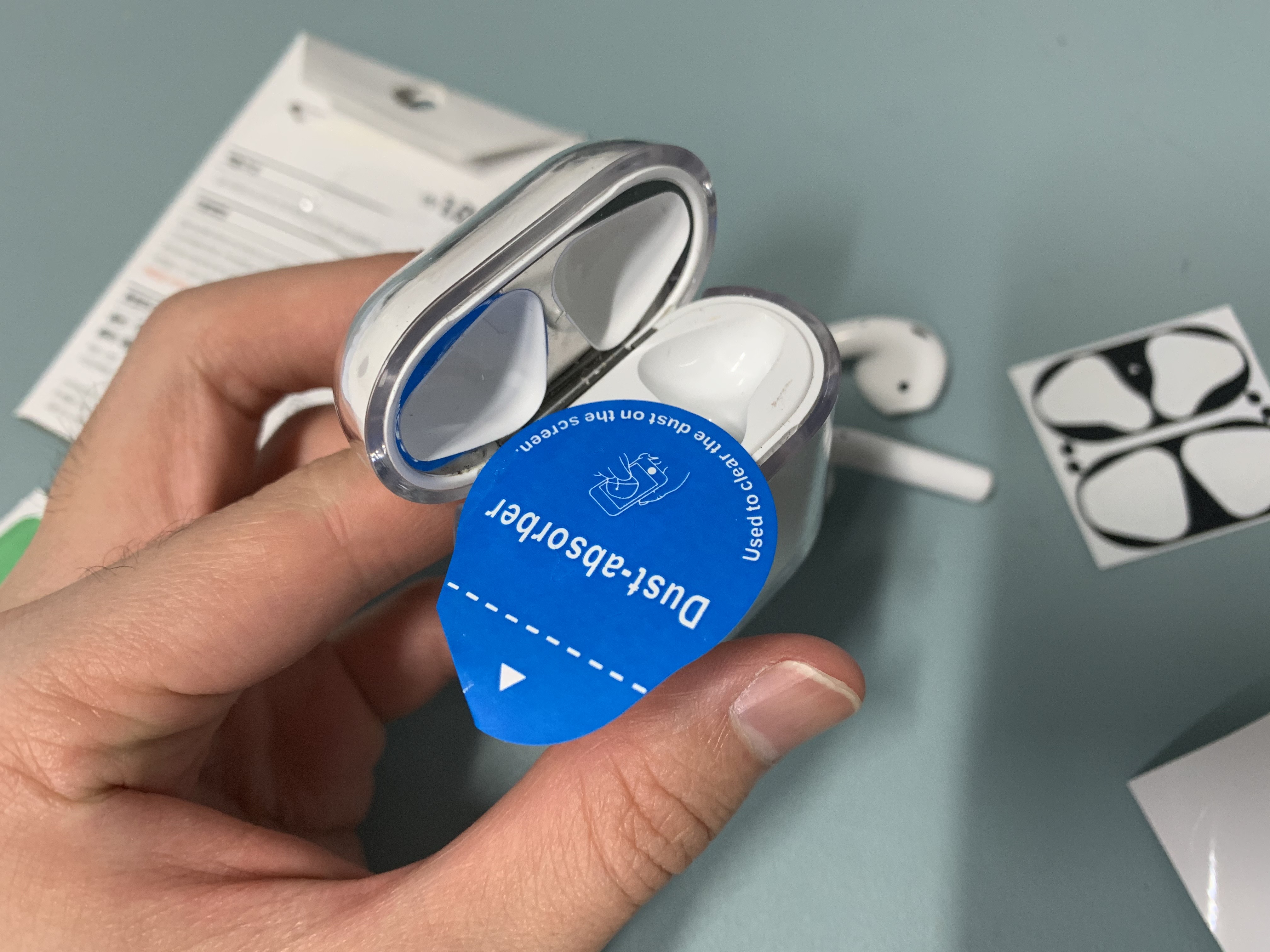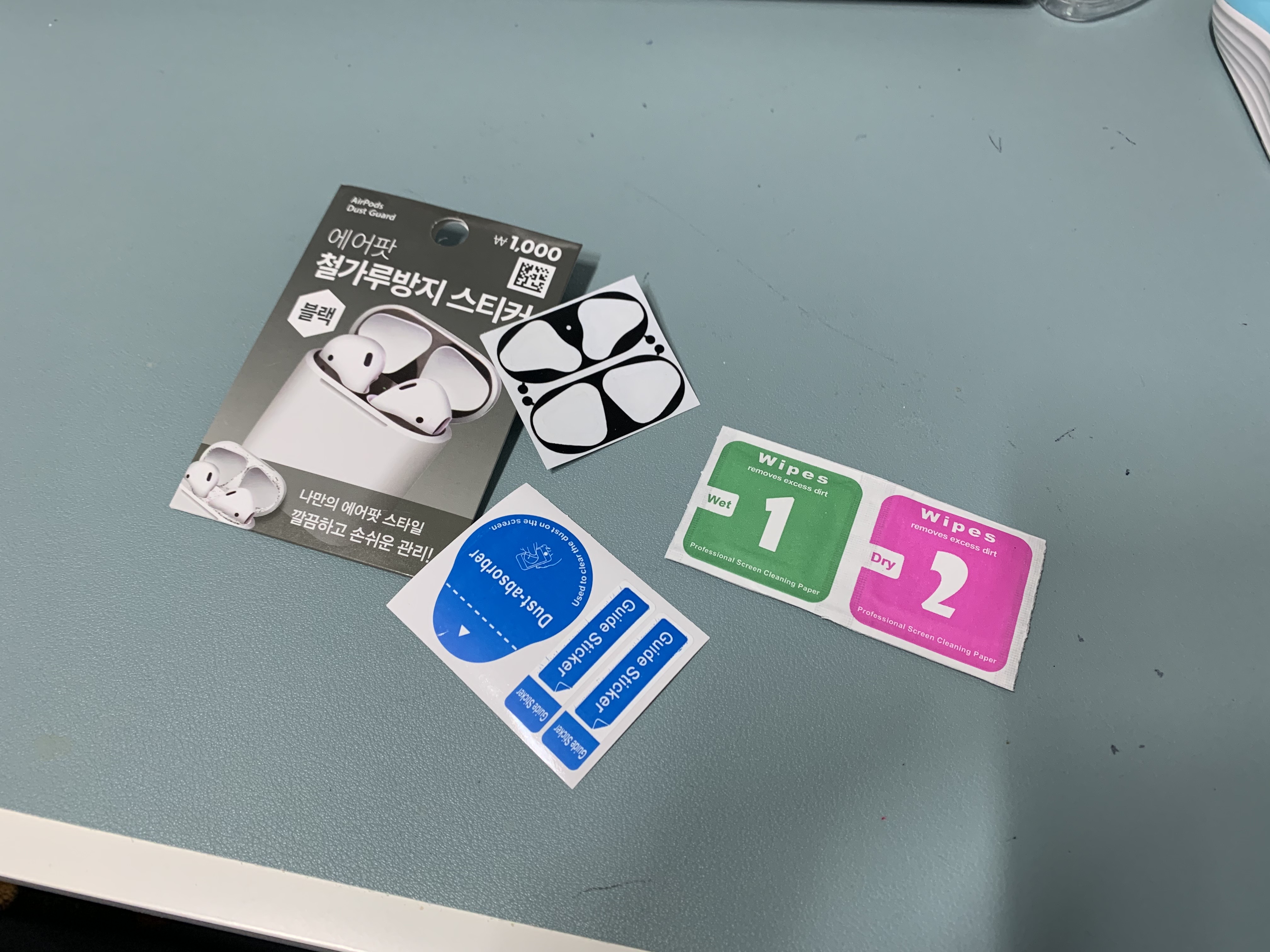 붙히는 방법은 간단합니다. 에어팟에 들어있는 콩나물?을 사진처럼 빼주고 에어팟 본체에 먼저 들어있는 클리닝페이퍼와 먼지제거스티커를 이용해서 부착면을 깨끗하게 닦아주어야합니다. 사진처럼 Dust-absorber가 들어있는데 테이프처럼 접착력이 있어서 붙어있는 먼지들을 제거할 수 있습니니다. 그리고 물티슈랑 dry 티슈같은게 들어있어서 깨끗이 닦아낼 수 있었습니다.