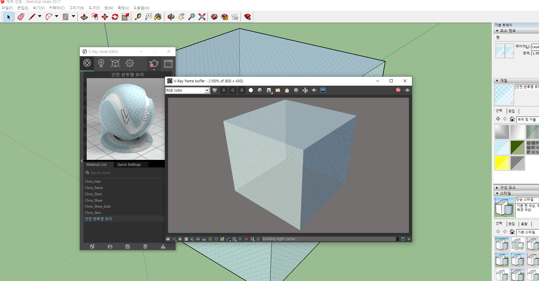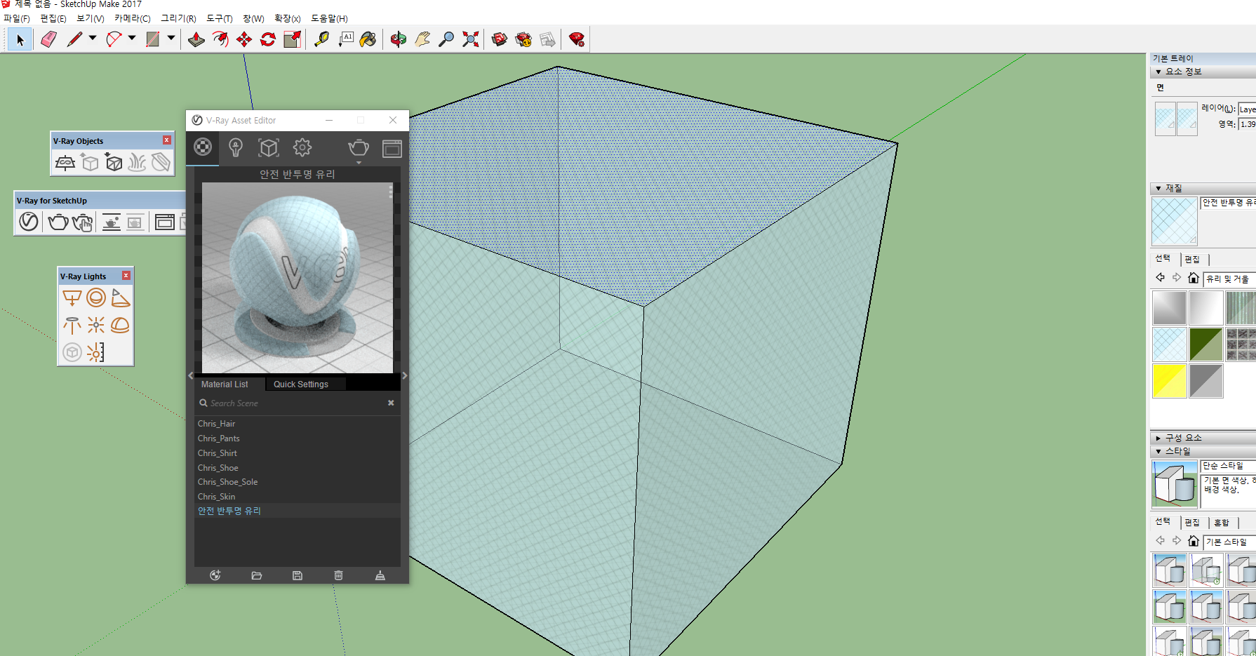 한번 상자의 재질을 유리로 변경한후에 렌더링을 해보겠습니다.
