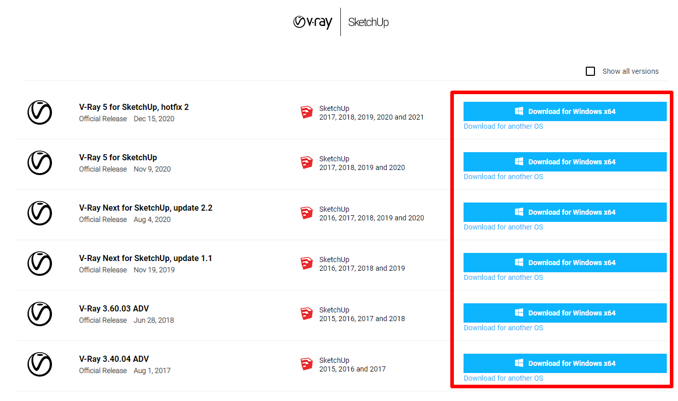 메뉴를 클릭하면 이런식으로 버전별로 브이레이가 나오게되는데 3ds Max, Maya, Sketch up, Rhino, Revit 등 다양한 프로그램에 작용이 가능한것을 볼 수 있습니다. 오늘의 목적은 스케치업 브이레이 다운로드이므로 V-ray for Sketch up을 클릭해주면 되겠죠?