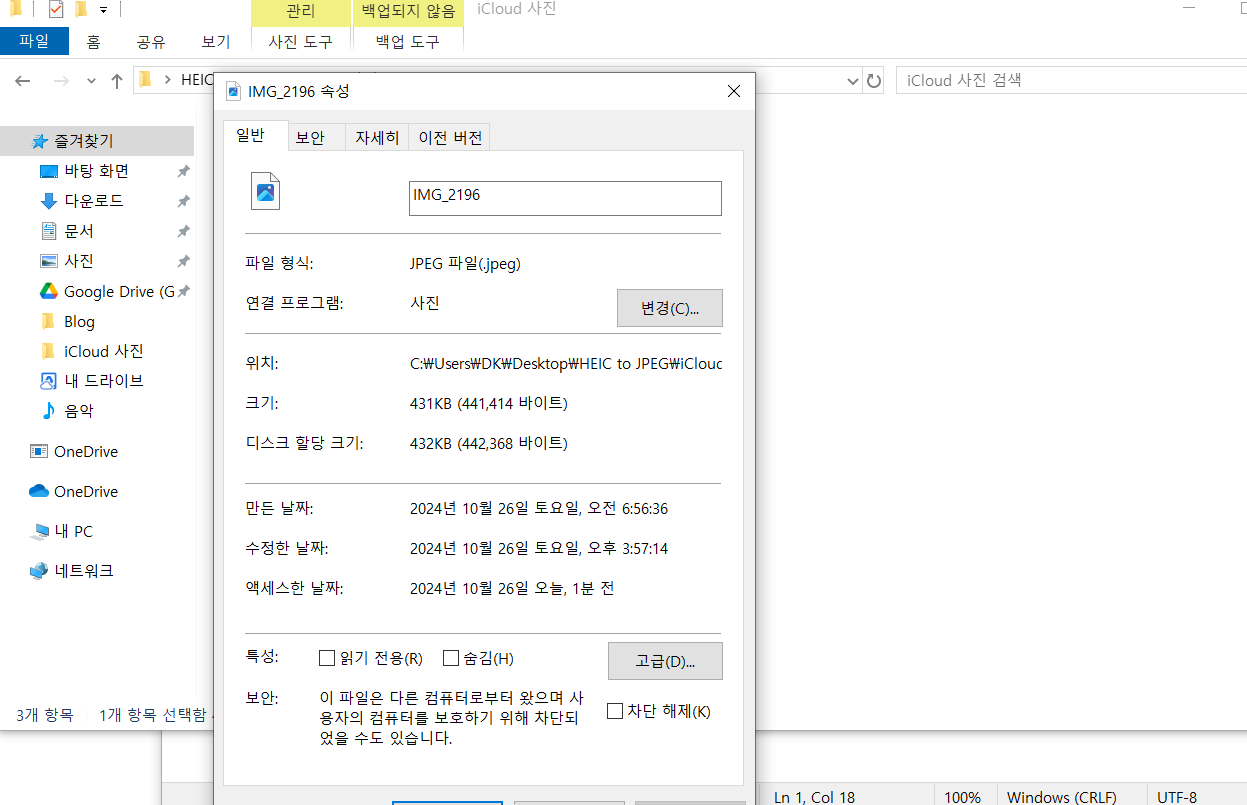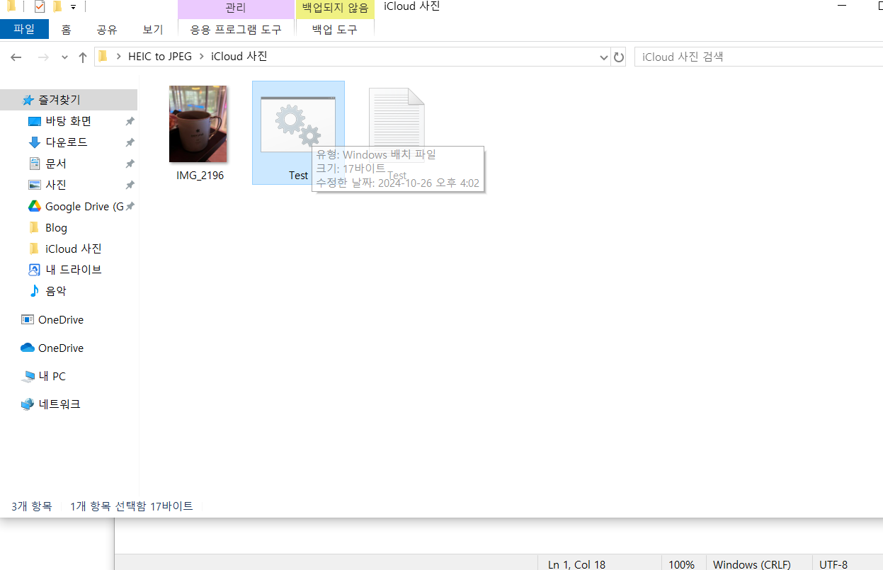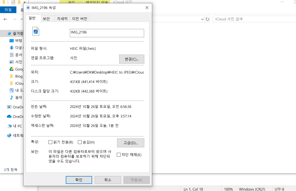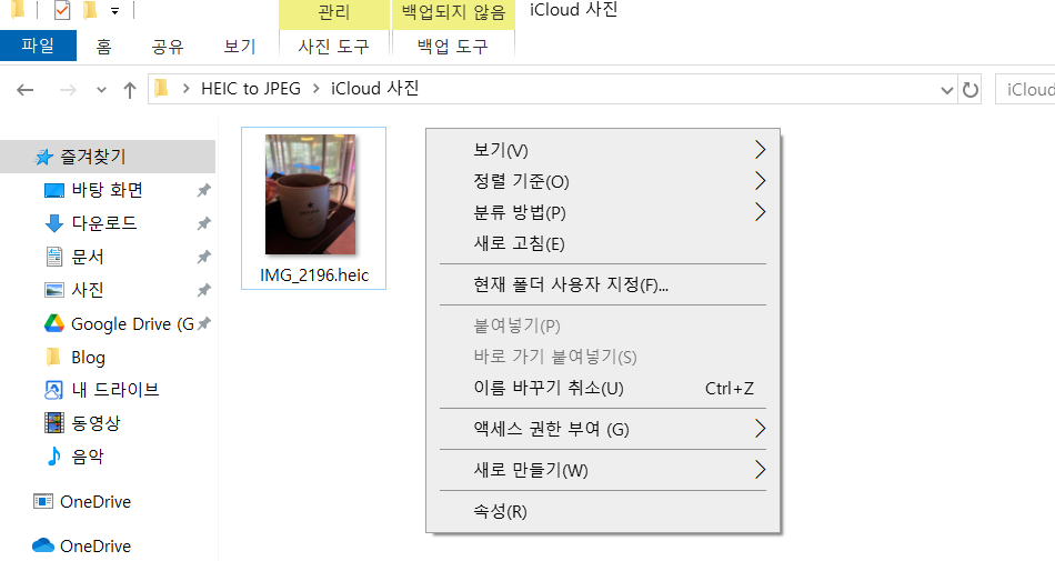 또 HEIC는 사진의 색감과 디테일을 더 잘 살릴 수 있어서, 사진이 더 선명하고 생생하게 느껴져요. 아이폰에서 ‘라이브 포토’나 심도 정보 같은 기능이 가능한 것도 HEIC 덕분이에요. 이런 정보들도 파일 안에 다 들어가서, 그냥 사진을 넘어서 여러 가지 효과나 느낌을 살릴 수 있는 거죠. 하지만 HEIC가 모든 기기에서 잘 열리진 않아서, 아이폰은 필요하면 사진을 자동으로 JPEG로 바꿔서 보내기도 해요. 그래서 오늘은 PC 데스크탑 및 노트북에서 HEIC 타입의 사진을 JPEG 로 바꾸는 법에 대해서 알아보려고합니다.