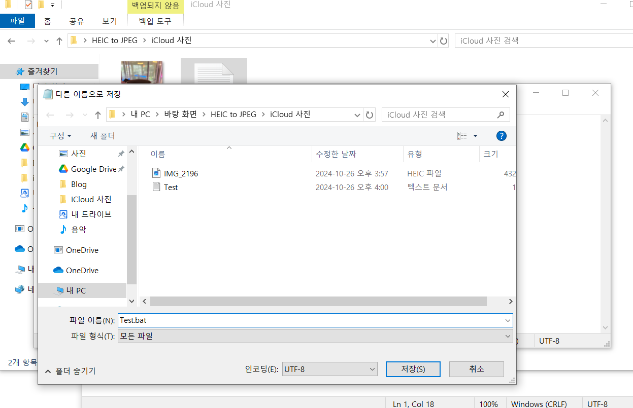 여기서 중요한건 확장자명을 .bat로 저장해야합니다. 제목은 마음대로 정하셔도 됩니다. 저는 Test로 적었습니다.