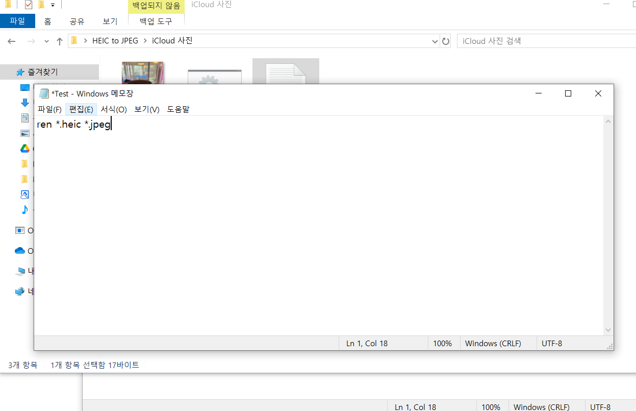 생성한 메모장에서 아래와 같이 적어주세요. 아래 명령어의 뜻은 heic to jpeg, heic를 jpeg로 변경해주는 명령어 입니다. 명령어만 조금수정하면 만약 bmp to png라면, ren *.bmp *.png로 적을 수 있겠죠?