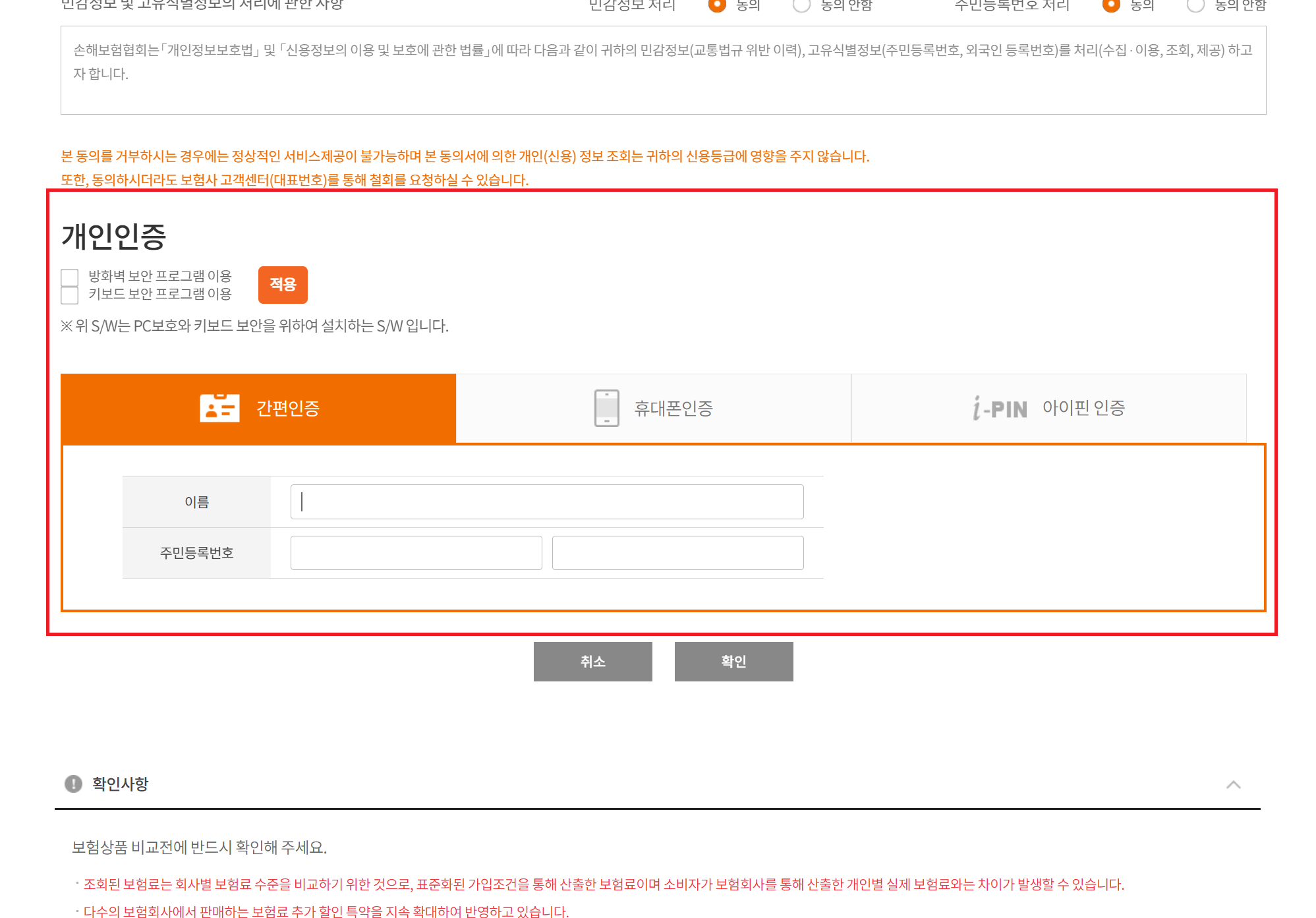 간편인증, 휴대폰 인증, 아이핀 인증 등을 통해 본인 인증을 완료합니다.