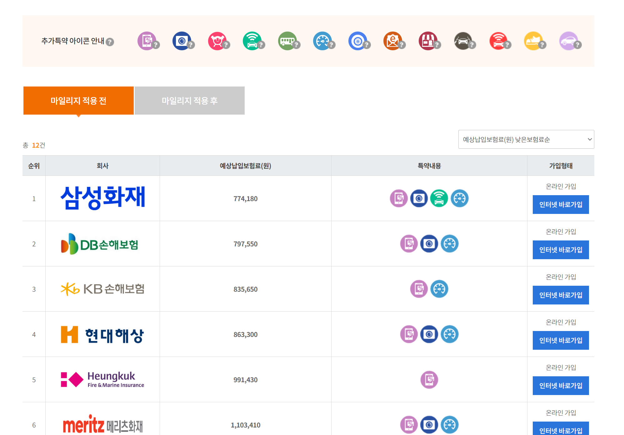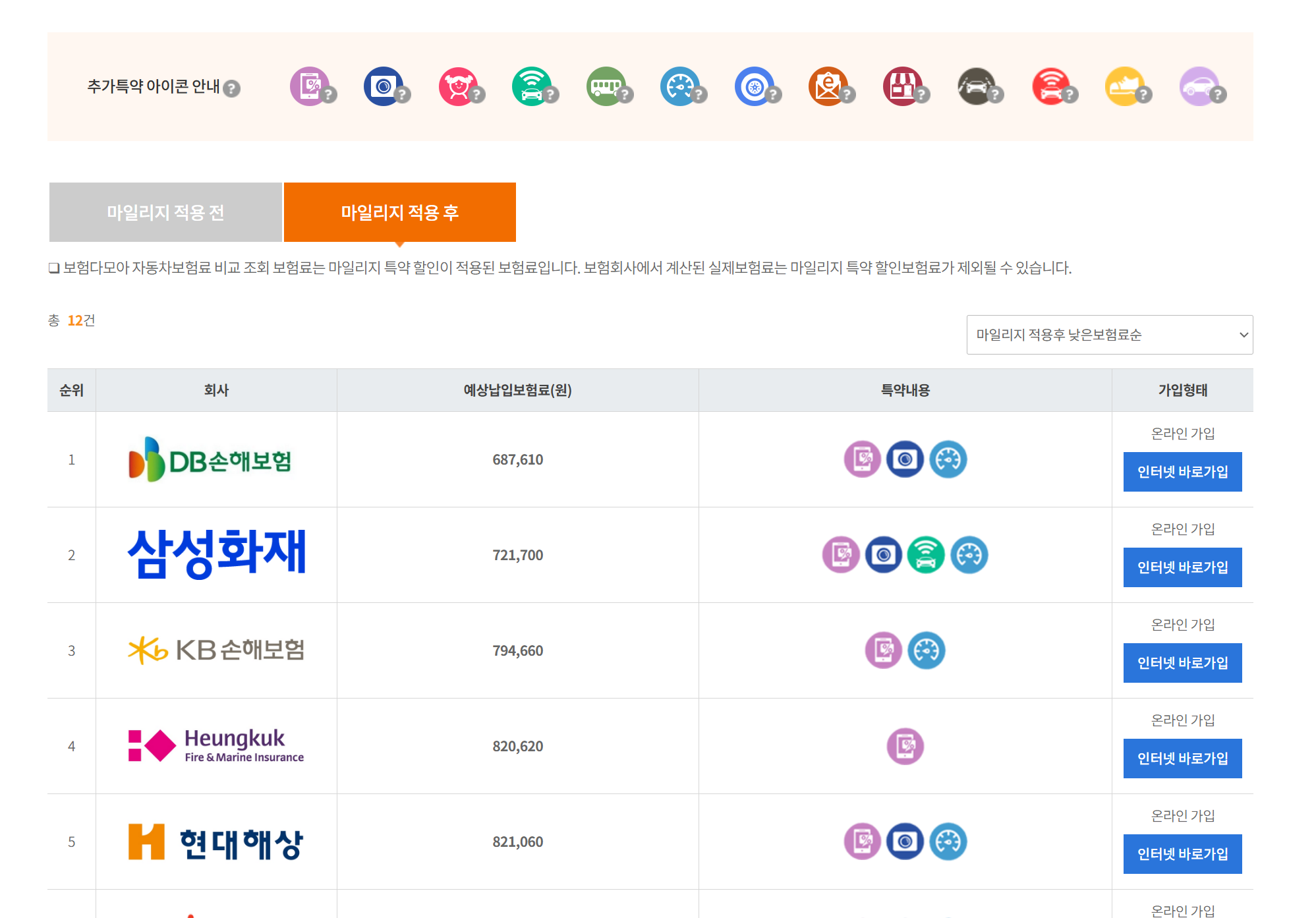 그리고 이제 보험료를 조회하면, 마일리지 특약 적용 전후 금액을 비교해볼 수 있습니다. 저는 연간 평균 주행거리를 11,000km로 입력했는데, 예상 보험료가 특약 전보다 마일리지 특약 할인분만큼저렴하게 나왔습니다. 이제 금액을 비교해보고 우측에 인터넷 바로가입을 클릭하여, 보험가입을 진행해보면 됩니다.