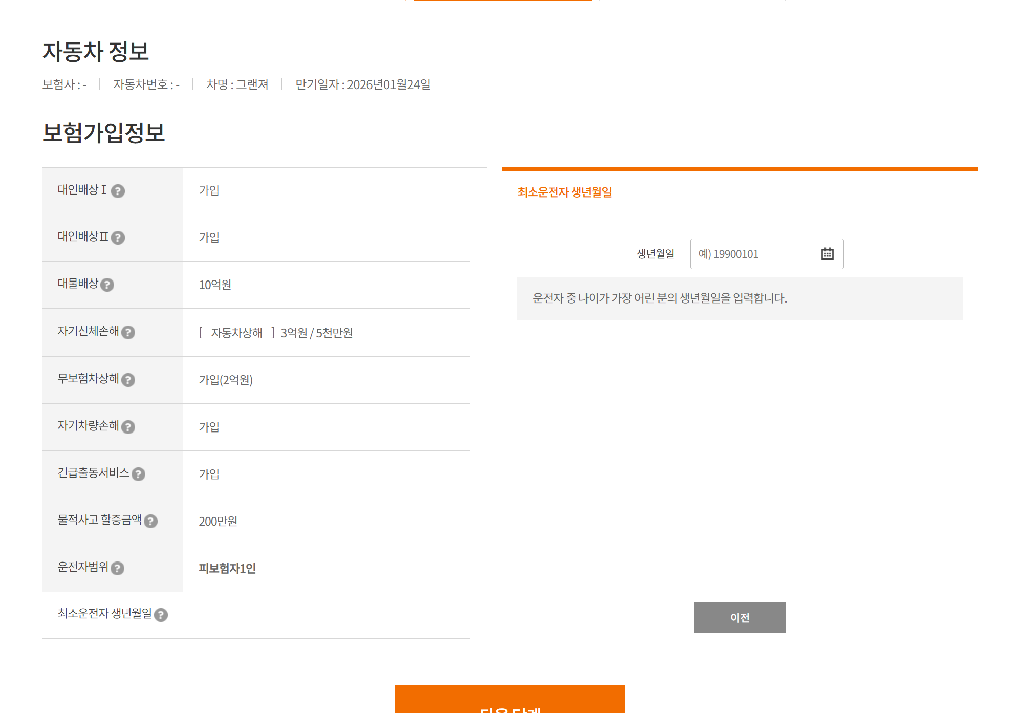 - 운전자 범위: 저는 피보험자 본인만 운전 가능한 조건으로 설정했는데, 추가로 다른사람을 더하면 보험료에 변동이 있을 수 있습니다.