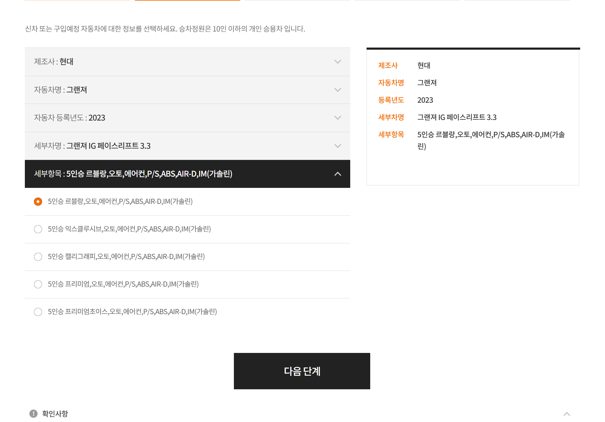 본인의 차량 정보를 제조사, 모델명, 연식, 세부차명 순서로 입력합니다. 예를 들어, 저는 그랜저를 선택해 진행했습니다.