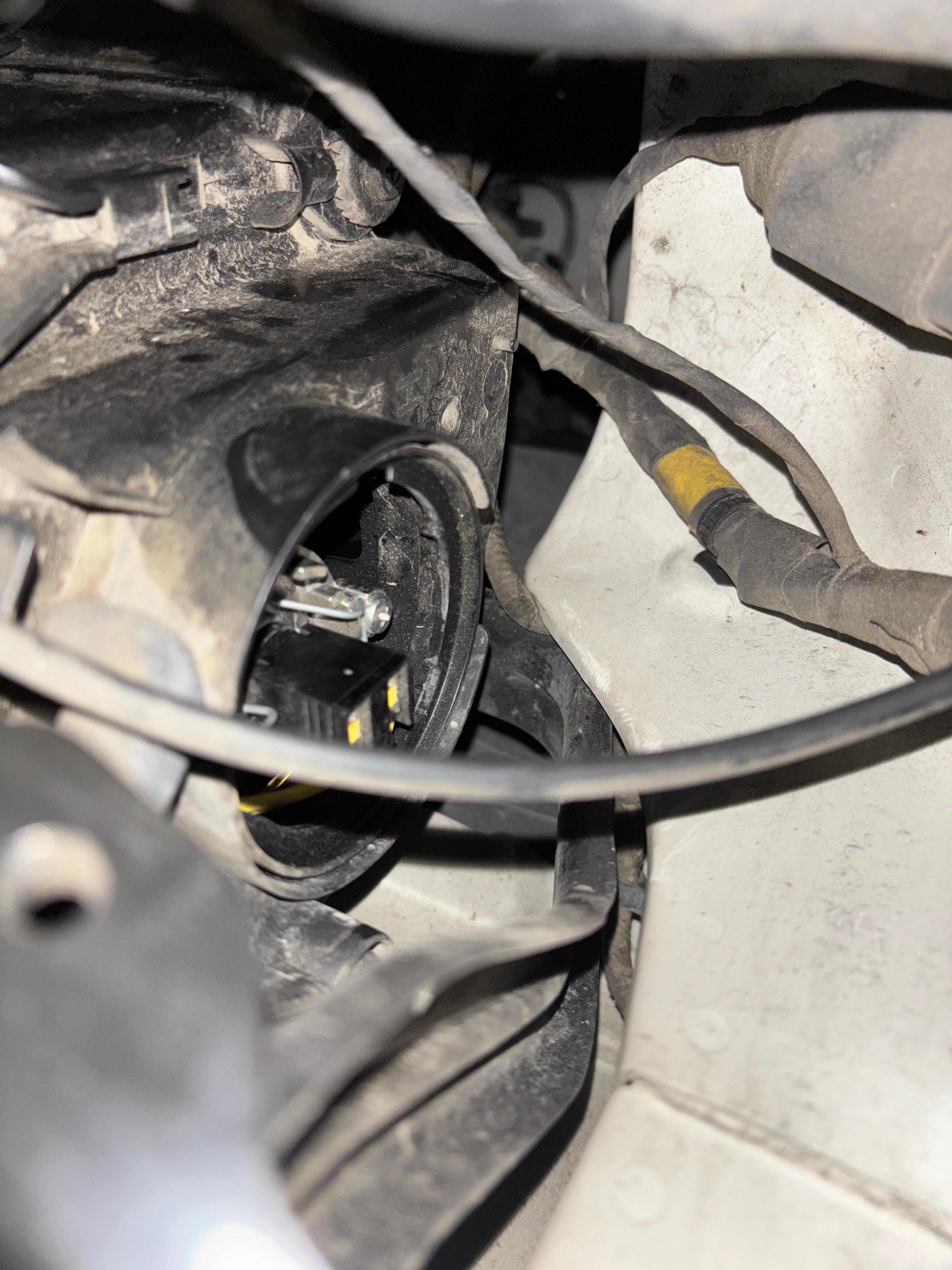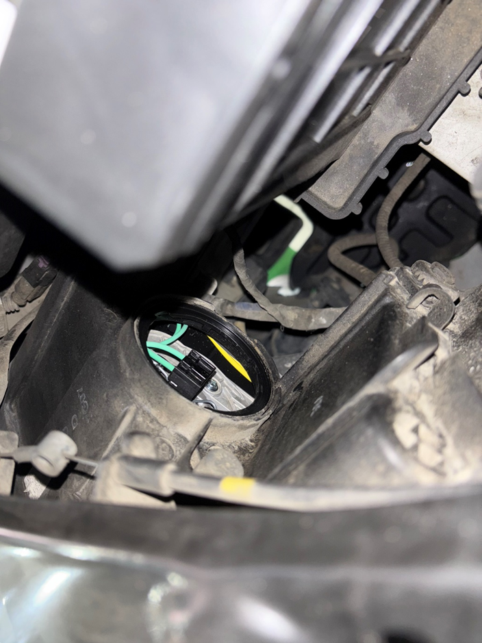 - 일반적으로 전조등은 헤드라이트 하우징 뒤쪽에 위치해 있으며, 플라스틱 커버나 고무 캡으로 보호되어 있습니다. 사진은 플라스틱 커버를 제거한 상태인데, 시계 또는 반시계 방향으로 탈거 후 확인 하면 위와 같은 케이블이 보이게 됩니다.