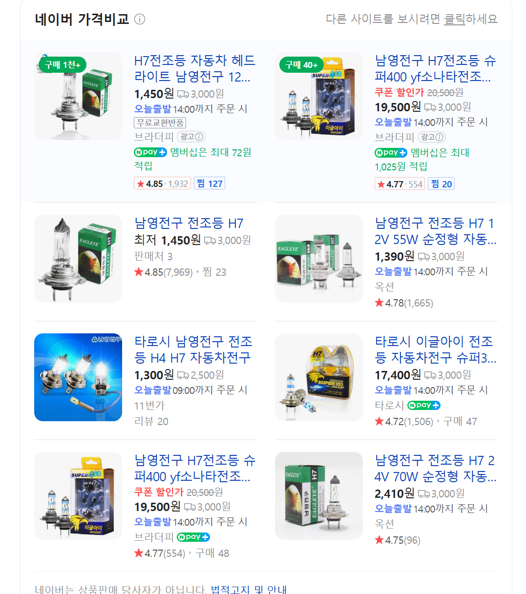 H7 전구는 차량의 전조등(로우빔, 하이빔)에 사용되는 제품으로, 직접 교체하면 공임비를 아낄 수 있을 뿐만 아니라, 내 차의 구조를 이해하는 데도 도움이 됩니다. 남영전구의 경우 가격대는 위와같이 형성되어있습니다. 차량에 따라 장착되어있는 모델이 다른데 검색해보면 쉽게 찾으실 수 있을겁니다.