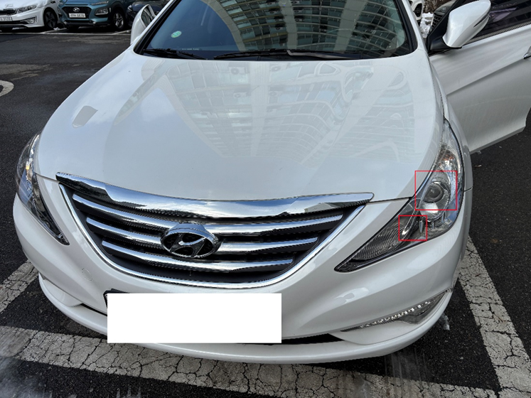- 차량의 본넷을 열고 전조등이 위치한 곳을 찾습니다. 사진에 표시된 빨간 박스를 따라서 찾아보시면 쉽게 찾으 실 수 있을 겁니다. YF 소나타 기준으로는 두개의 전구가 위치해있으며 각각의 사진을 찍어봤습니다.