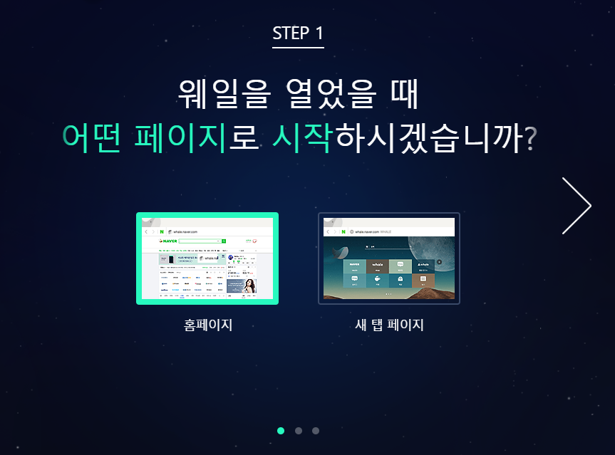 설치가 완료됐으면 웨일 브라우저가 실행되면서 위화면과 같은 설정 창이 나올겁니다. 자신이 원하는 항목에 체크해서 오른쪽에 보이는 다음 화살표를 클릭해주세요.