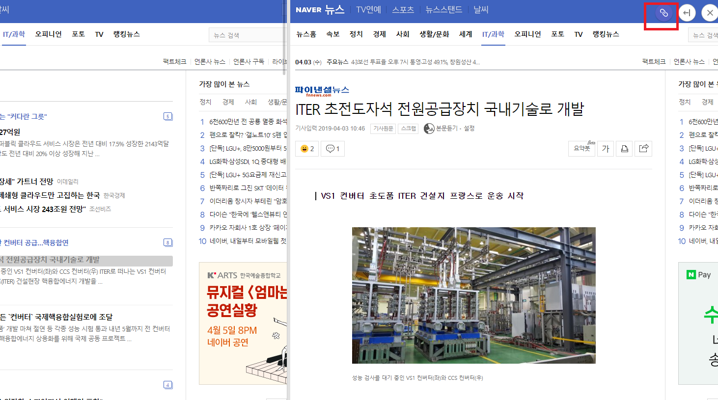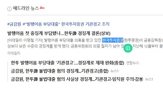 다음으로는 네이버웨일에서 주로 홍보하던 기능에 대해서 살펴보았는데 첫번째로는 위사진처럼 인터넷기사같은글을 드래그해서 선택하면 초록색 검색아이콘이 나오게됩니다.