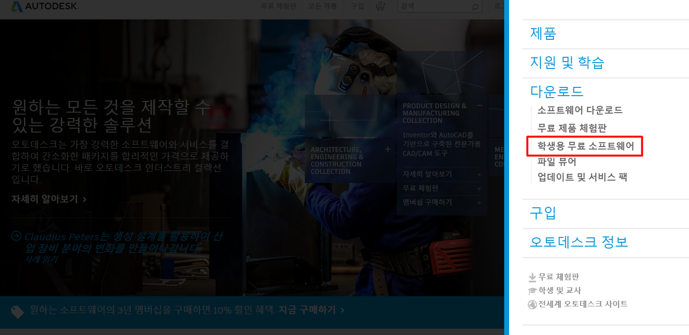 링크로 이동했으면 위와같은 오토데스크 사이트로 이동이 될겁니다. 우측상단에 보이는 메뉴를 클릭해주세요.