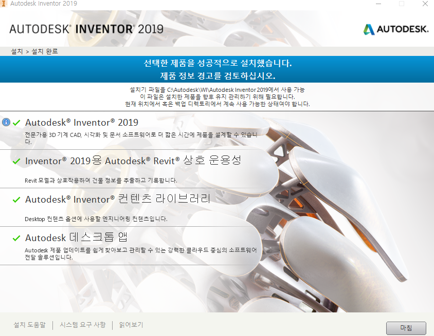 드디어 설치가 완료되었습니다. 컴퓨터를 다시시작해야 완전히 설치가 될텐데요 다시시작하라는 화면이 나오면 다시시작후 인벤터를 실행해주세요.