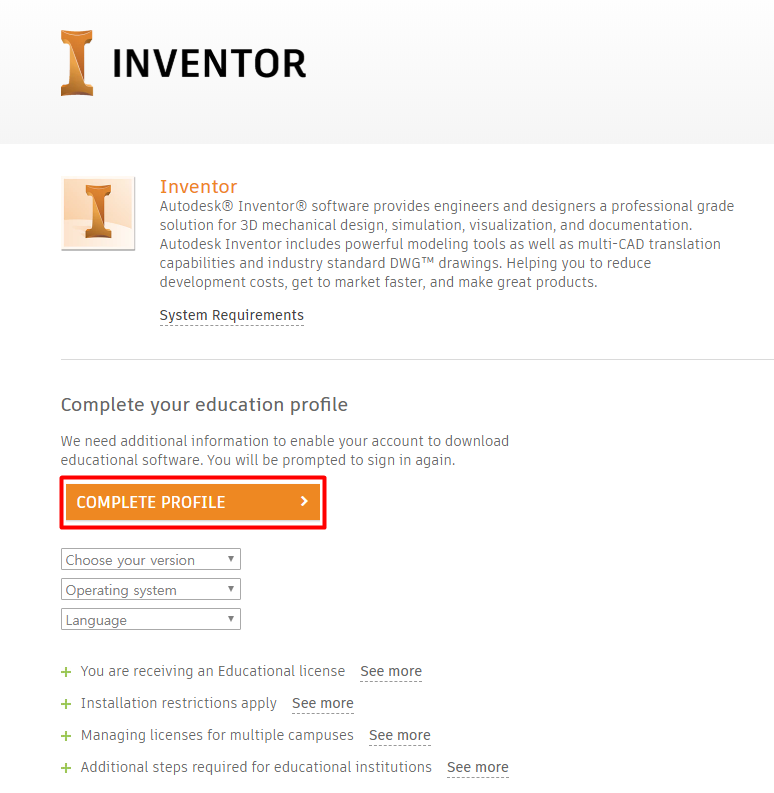 다시 인벤터 학생용 다운로드화면으로 이동해주세요. 로그인한후에 다운로드화면을 보면 위에사진처럼 나올텐데 'complete profile'을 클릭해주세요.