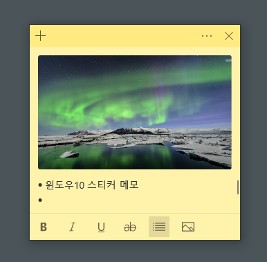 그럼 우리가 일반적으로 보던 포스트잇 디자인의 스티커 메모 위젯이 실행됩니다. 이 스티커 메모기능은 컴퓨터를 껐다 켜도 바탕화면에 내용이 그대로 유지되기 때문에 자신이 해야할 일 이나 기억해둬야하는 항목들을 적어 놓으면 정말 편한 기능같습니다. 그리고 윈도우10 버전에서는 ms계정을 등록하면 다른 컴퓨터에서도 연동이 가능하다고 하니 참고하시길 바라겠습니다.