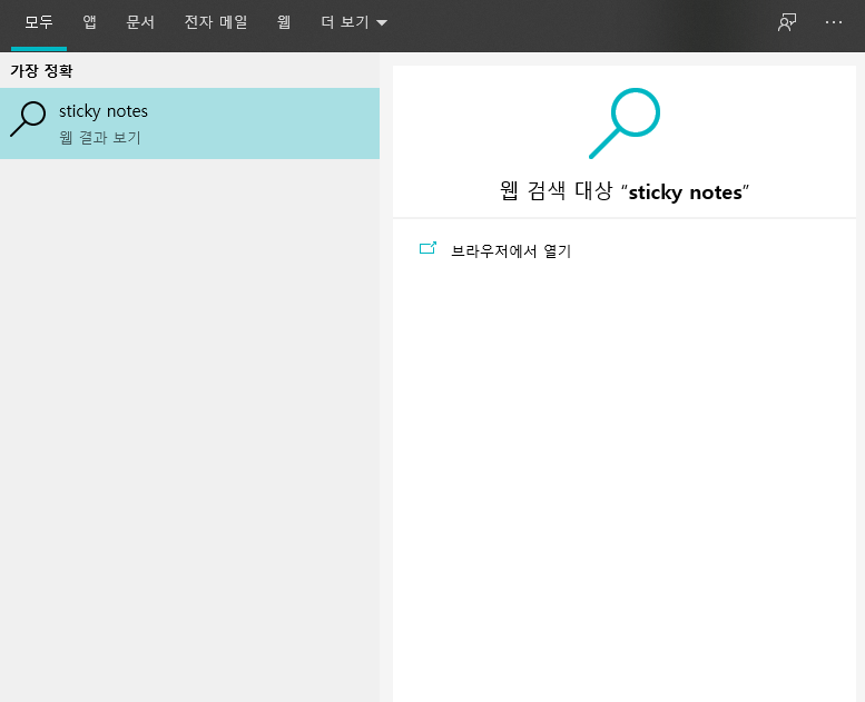 윈도우 버전에 따라 다른건지는 정확히 모르겠지만 대부분의 컴퓨터에서는 sticky notes라고 검색하면 나온다고 합니다. 하지만 제 컴퓨터에서는 영어로 검색하면 나오지 않더군요