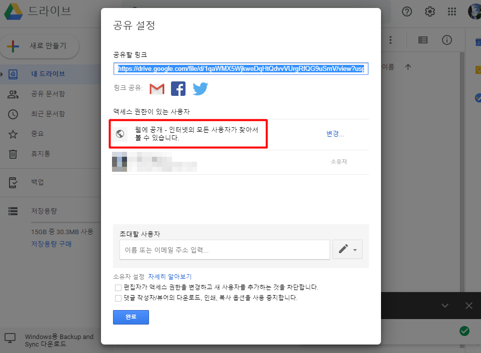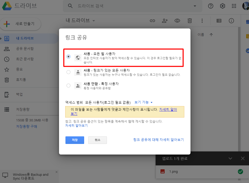 그러면 이 링크를 클릭했을때 파일을 볼 수 있도록 접근이 가능한 사람을 설정할 수 있는데 여기서 '모든 웹 사용자'를 클릭하면 특별한 권한없이 모든 사용자가 파일을 열람할 수 있습니다. 이러한 상태로 저장을 해준다면