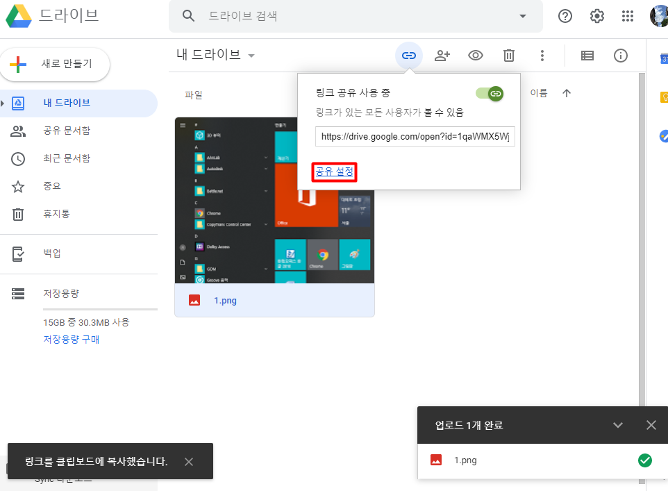 위에 사진처럼 링크 아이콘을 클릭해주세요 여기서 '공유설정'을 클릭해줍니다.