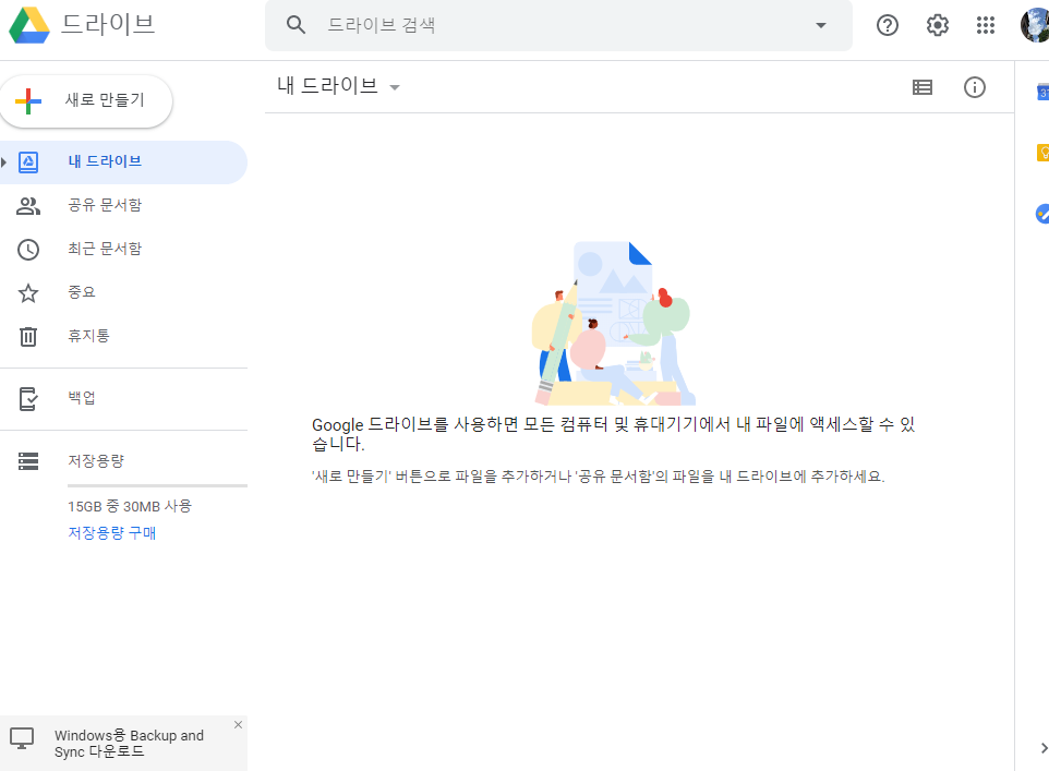 구글 드라이브에 들어가면 보이는 맨 첫번째 화면입니다. 저같은 경우는 아무 파일도 없는상태라 이렇게 빈 상태로 화면이 나옵니다.