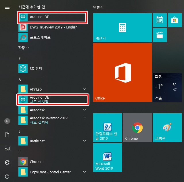 그리고 IDE가 설치되었는데 바탕화면에서 없어서 당황하실수도 있을 것 같아서 이렇게 설명을 남깁니다. 시작화면에 들어가보면 새로 설치된 아두이노 IDE 아이콘을 쉽게 찾을 수 있으니까 여기서 바탕화면이나 하단바에 추가해서 사용하시면 될 것 같습니다!