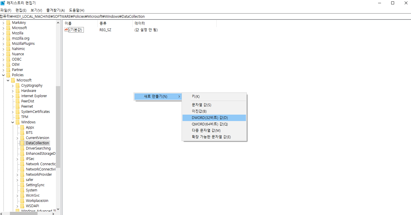 그다음 오른쪽마우스 클릭후 새로만들기에서 DWORD(32비트) 를 클릭해준뒤 키: Allowtelemetry, 데이터 : 0 입력후 확인을 클릭해줍니다. 그다음 윈도우를 재시작 해주면 설정이 완료됩니다.