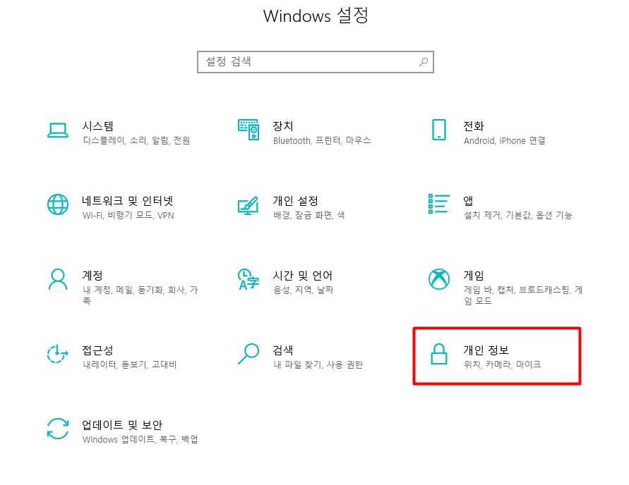 윈도우 설정화면 입니다. 여기서 '개인정보' 자물쇠모양 아이콘을 클릭해줍니다.