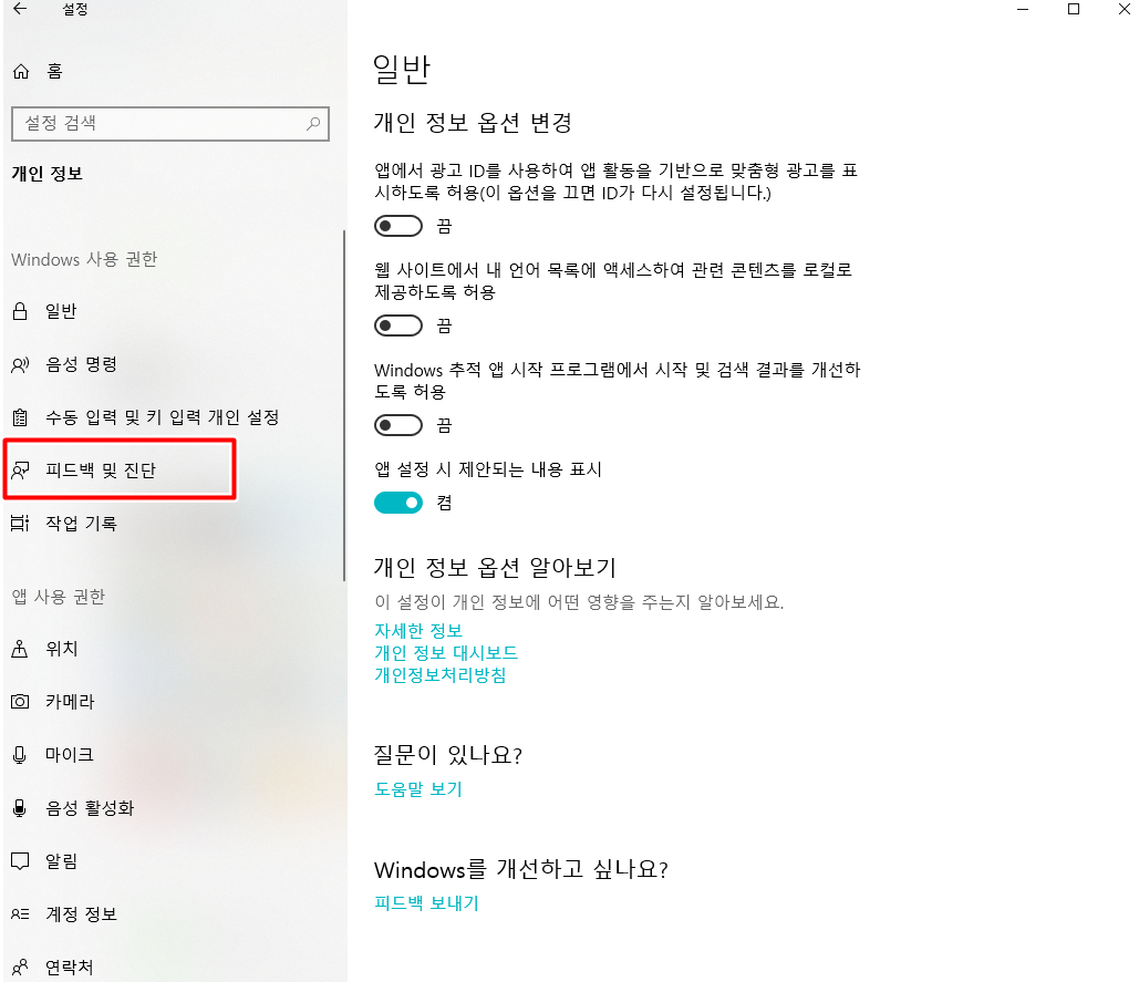 여기서 왼쪽에보면 '피드백 및 진단' 이라는 항목이 있는데 클릭해줍니다.