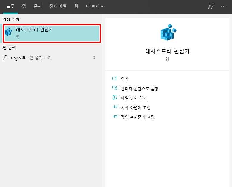 이 방법은 레지스트리 편집을 이용한 방법인데요 시작검색창에 regedit 라고 검색을 해주면 위와같이 레지스트리 편집이 나오게됩니다.