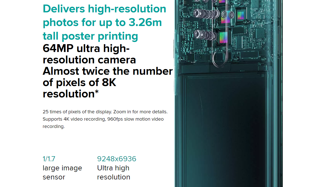 6400만화소 메인카메라 64MP (ultra high-resolution primary camera) 800만화소 120° 광각카메라 (ultra-wide angle lens) 200만화소 2cm 매크로 카메라 ultra-macro lens 200만화소 딥센서 카메라 depth sensor 2000만화소 전면 카메라20MP Front Camera |