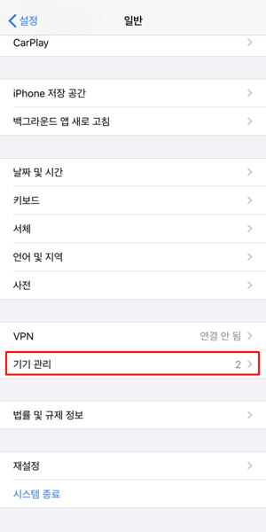 위와같이 신뢰할 수 없는 기업용 개발자 라는 안내가 나오게되죠. 그래서 우리는 설정으로 이동해서 '기기관리' 설정을 해주어야 합니다.