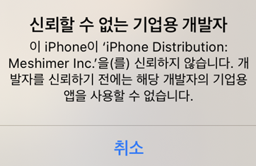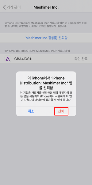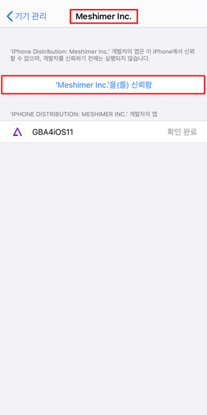 들어가면 GBA4iOS11 항목이 나올텐데 'Meshimer Inc.신뢰함'을 선택해줍니다.